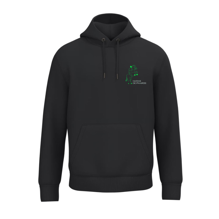Broderie sur le cœur et dans le dos. En vert fluo : le cheval du logo / En gris clair : l’écriture : Haras de Pharos.